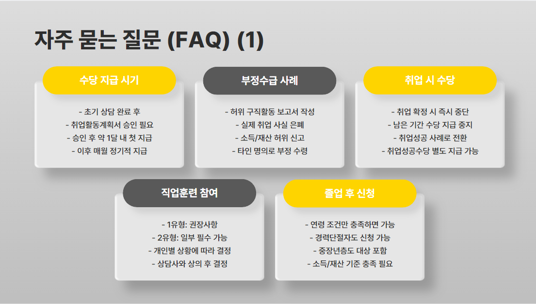 - 2유형: 1유형보단 조건이 덜 까다롭지만 현금 지급은 없고 직업훈련 및 알선 위주