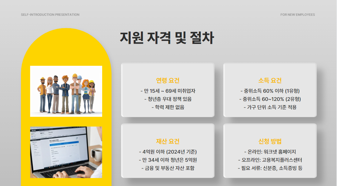 만 15세~69세 사이의 미취업자면 거의 대부분 지원 가능하고, 소득 요건과 재산 요건도 확인해야 합니다.