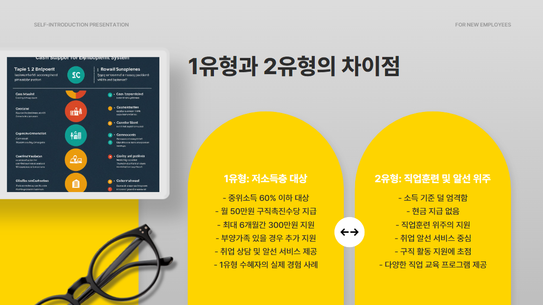 - 1유형: 저소득층(중위소득 60% 이하) 대상으로 구직촉진수당 최대 월 50만원씩 6개월 지급